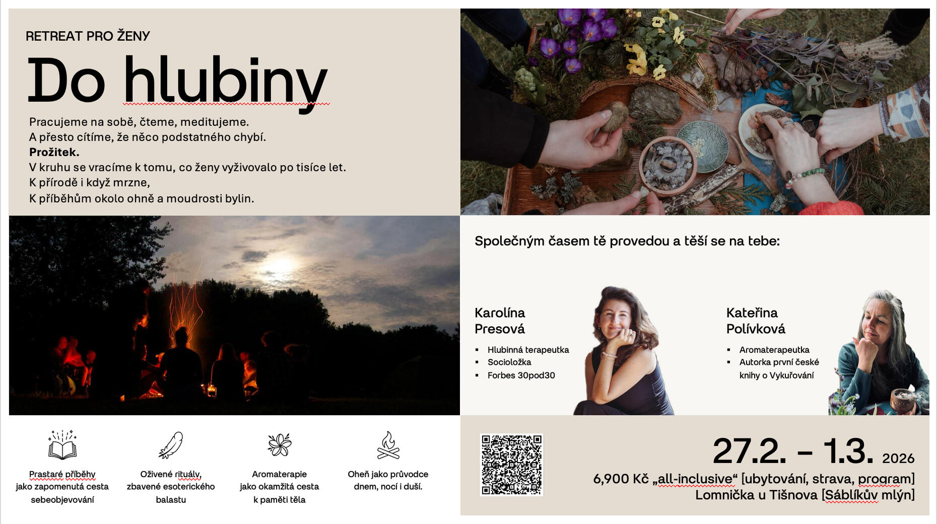 Pro ženy, které nehledají únik, ale hloubku, spojení se surovou zimní přírodou. Vše laděné hlubinným psychoterapeutickým směrem podpořené profesionální aromaterapií.• V ceně je ubytování, plná penze, lektorné (6900 Kč).• Lomnička u Tišnova, Sáblíkův Mlýn• Registrace na [email protected]Spolupořádá Kateřina Polívková z dobrevune.cz a Karolína Presová (Hvozd)
